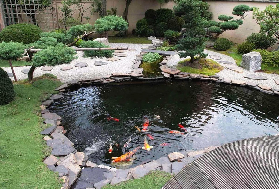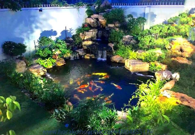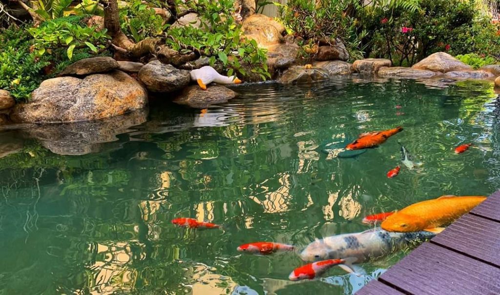 Một trong những tiểu cảnh sân vườn được ưa chuộng hiện nay là tiểu cảnh kết hợp hồ cá Koi. Hồ cá Koi không chỉ tạo điểm nhấn nổi bật cho không gian mà còn mang lại yếu tố phong thủy cực kỳ tốt. Cá Koi, với ý nghĩa mang lại may mắn, tài lộc và sự thịnh vượng, kết hợp với cây xanh tạo nên một bức tranh thiên nhiên sinh động, sang trọng và cuốn hút.
